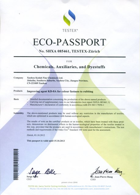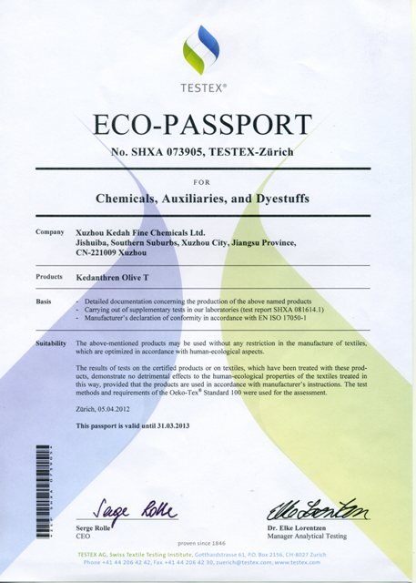2011-2012年,我公司主要產(chǎn)品開達士林橄欖T、干、濕摩擦牢度提升劑KD-8A在TESTEX瑞士紡織檢定有限公司(國際環(huán)保紡織協(xié)會(Oeko-Tex Association)秘書處)進行了生態(tài)安全認(rèn)證,獲得了生態(tài)認(rèn)證合格證書。